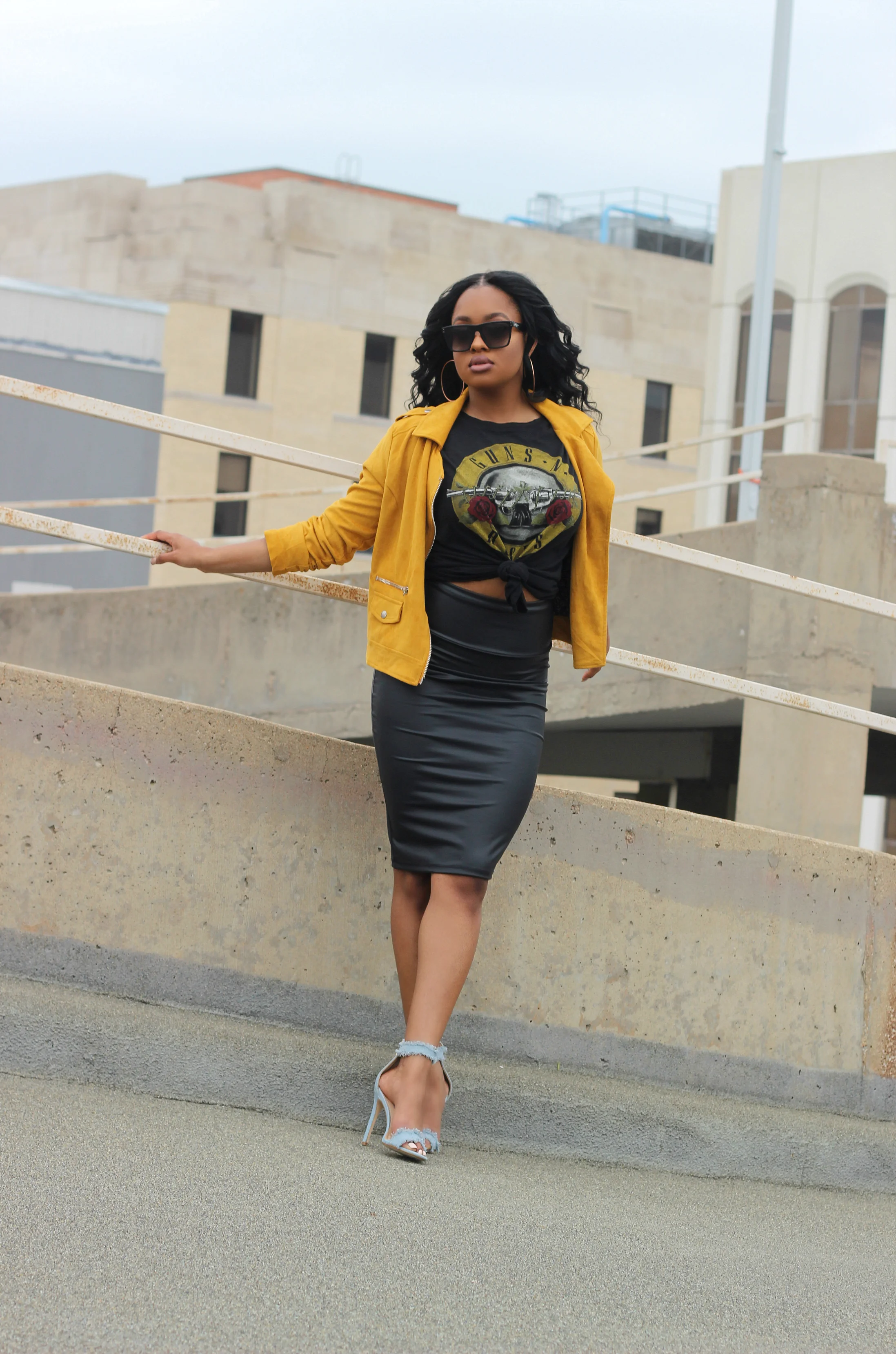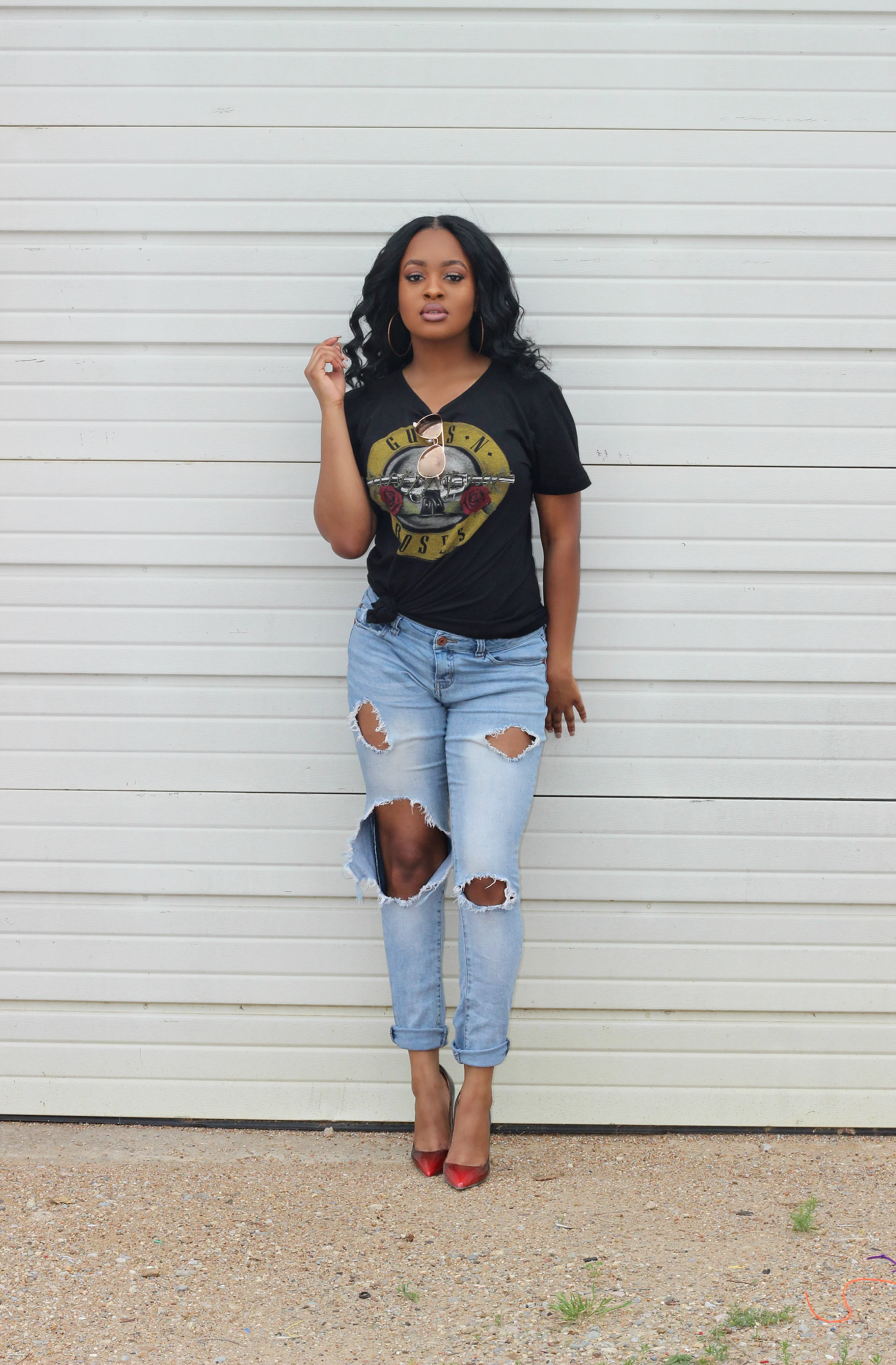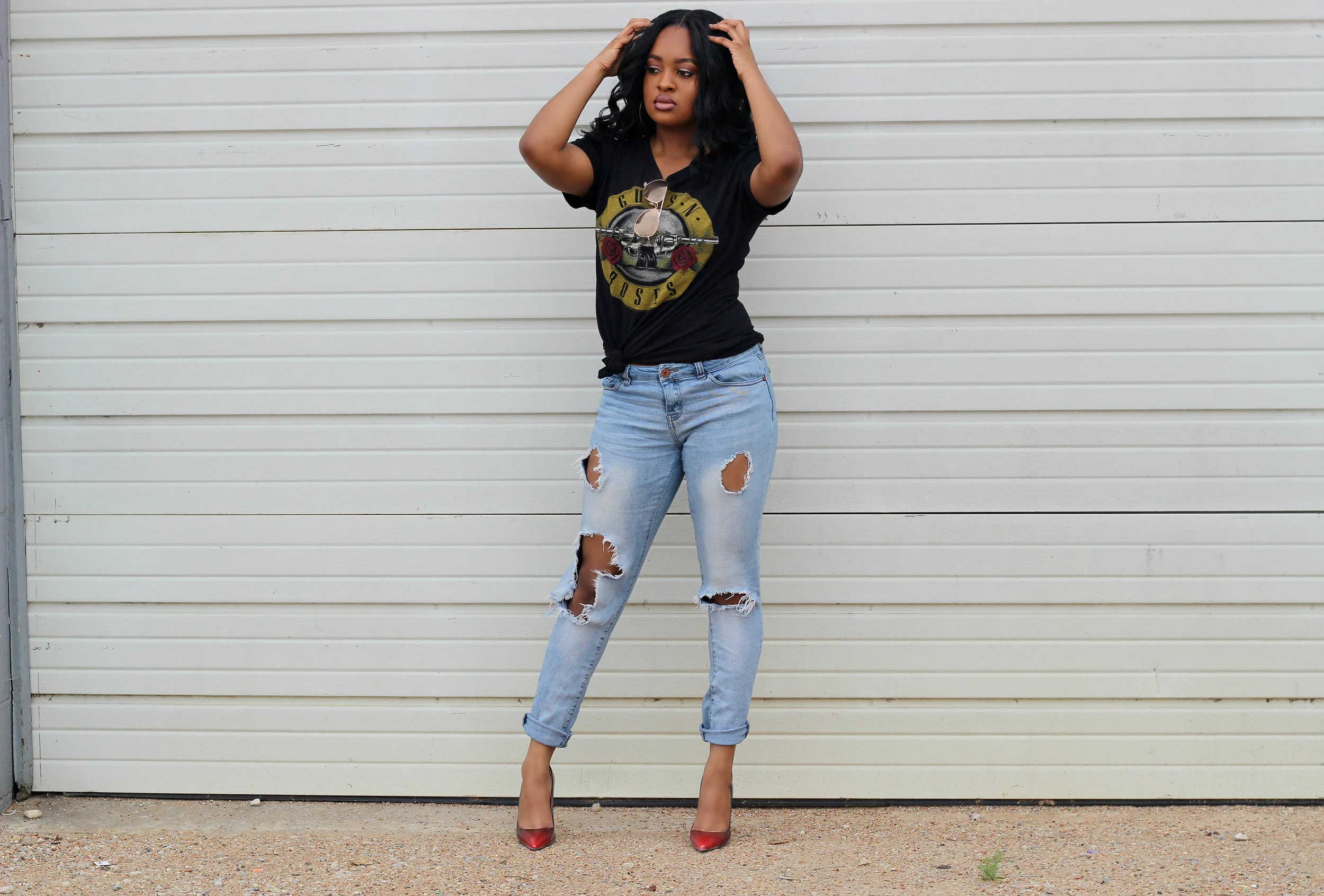 If you have been following me since the beginning, you know that I love giving you all a "two for one". Taking one garment of clothing and giving you different looks that either fit your personality, you can turn from day to night, or just give you ideas you may have never thought of before! So today, I bring to you a "How to Style: The Band Tee". A simple scoop neck shirt, that you can find in any store (online and in your local mall) that showcases either a band, artist, group, brand, and so on and so forth. One thing you will learn about me is that, I go for outfits that look like I took a lot of time and effort to put together...yet are the most simplest ones that I just pulled from my closet. This is one of the main reasons why I find myself not only stocking up on graphic tees, but just basic shirts in general. It is so easy to switch up your entire look, by going from jeans, to a skirt, and sneakers to heels, and by also changing your accessories. The two looks I put together here, I would not necessarily call it a day to night look, because honestly, I would wear either during anytime of the day. Do not be afraid to mix those patterns, mix that black tee with light wash jeans because, it looks better than you would think. Dare to dress up your basic "band tees" for a night out with the girls. It is all about taking simple pieces in order to maximize your closet and the band tee, will do just that!